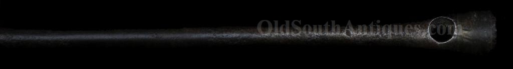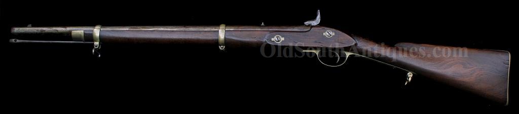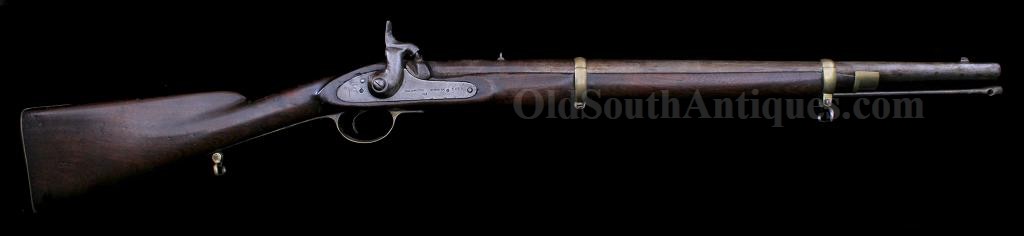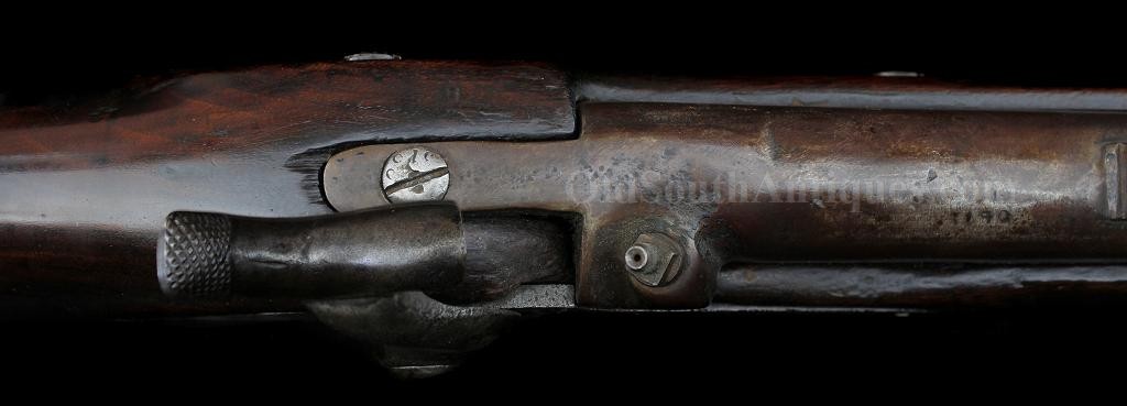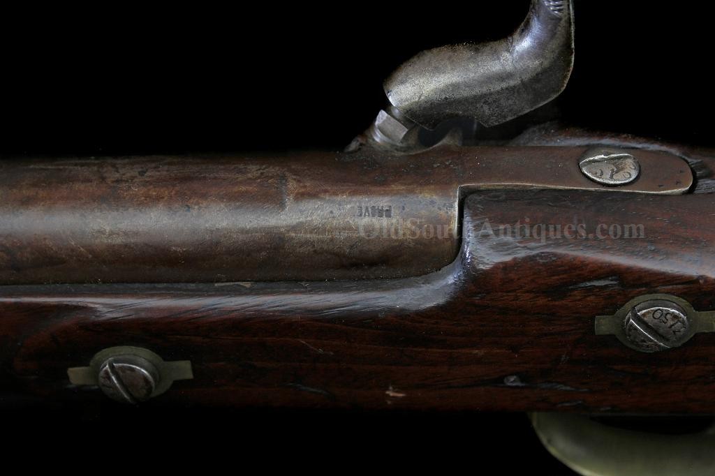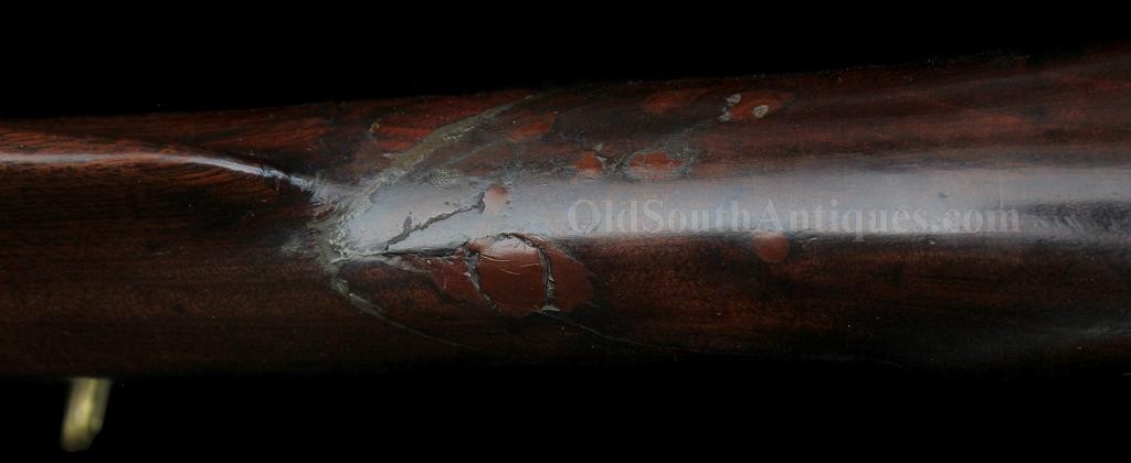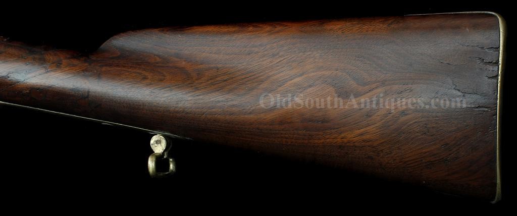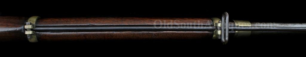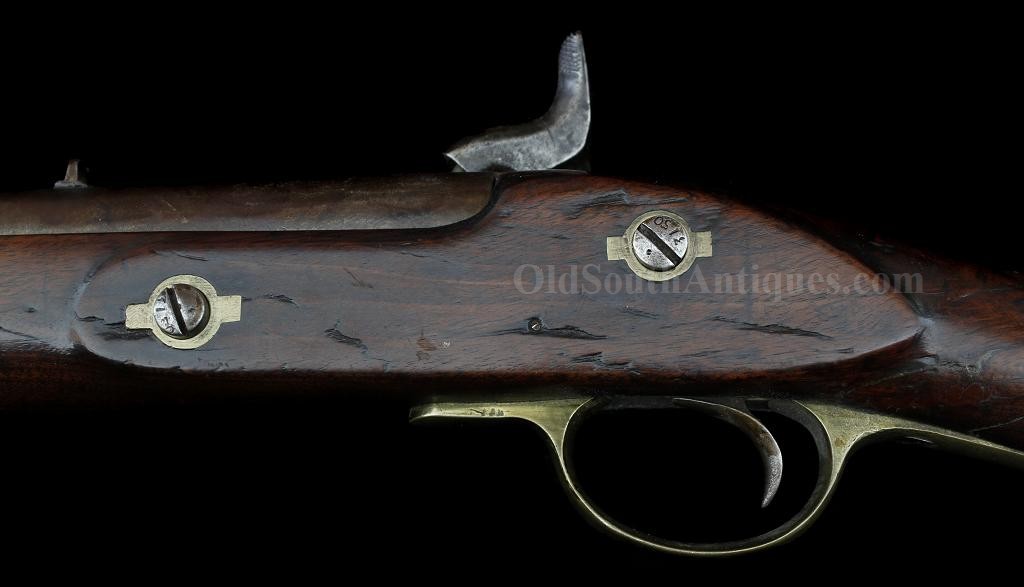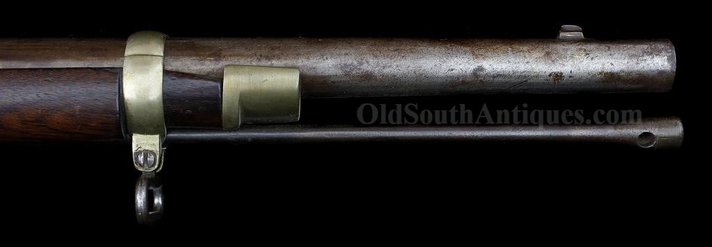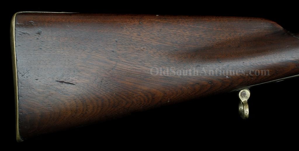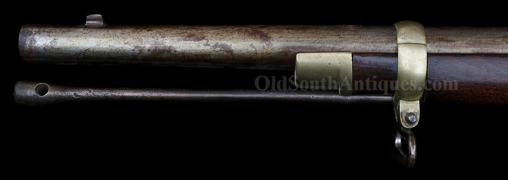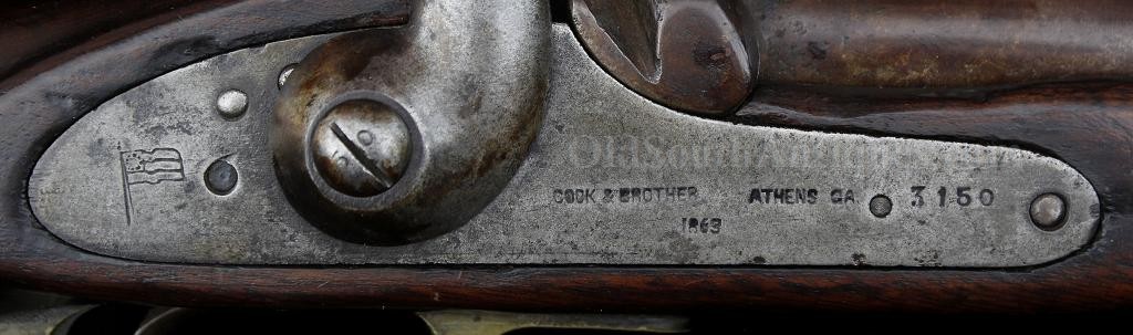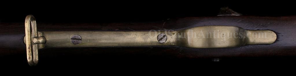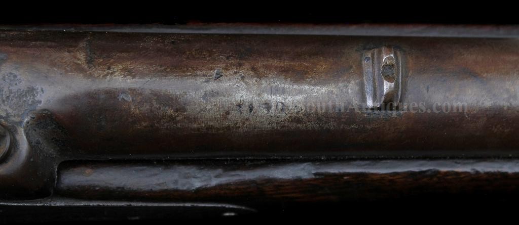 While speaking of the South, English immigrants from England, Ferdinand and Francis Cook determined "that rifles could be made here as well as in Yankee land or in Europe”, and proceeded to open a weapon manufactory at Number One, Canal Street in New Orleans in June of 1861. Mr. Cook knew what he was talking about and what he was doing. The rifle they produced was said by a Confederate ordnance officer to be "superior to any that I have seen of Southern manufacture." And its quality truly was not excelled in the South, and, with the exception of the raw materials, not in the world. With the fall of New Orleans in April 1862 the company moved to Athens, Georgia. There they set up a manufactory to produce rifles, carbines, bayonets swords, carbine slings, pikes, etc. This carbine is Cook serial number 3150, and is very well marked. The lock is stamped with the Confederate First National Flag and "Cook & Brother Athens GA. 1863”. The serial number 3150 is stamped into the lock plate, the barrel, the rear barrel band, the front barrel band, the nose cap, the heads of the lock screws and the head of the breech tang screw and the word "PROVED” is deeply stamped into the barrel opposite of the nipple. The year stamped into the barrel just above the serial number is still mostly visible, but weak. Many of the small internal parts are marked with the same serial number or the last two digits. In other words, this is one 100% correct, with the exception of the wrong, but original to the period, ramrod, and possibly the front sling swivel. I say possibly because it is clear that the screw is original, and has not been out for many long years, so it may have left the factory this way, but I want to be upfront and say that I would expect it to be brass. The action works perfectly; the bore has good strong rifling and it is an exceptionally well-marked gun. The stock is in very good condition overall, having only minor dings and dents and a beautiful overall patina, save for at the wrist. As shown in the photographs the wrist of the gun has been broken in two and repaired. I suspect the gun was intentionally damaged during the War, as the repair is very, very old and there is no pretense at hiding it. The natural patina over the repair makes in hardly noticeable in real life; the photo makes it much more noticeable than it is. The gun’s lock is in excellent condition, with all of the marks being very clear, especially the Confederate Flag. The barrel is in very good condition with really noticeable metal twist marks visible; it appears at some time the area around the nipple was sanded to remove some of the pitting caused by the powder and recolored and this was not many years ago.