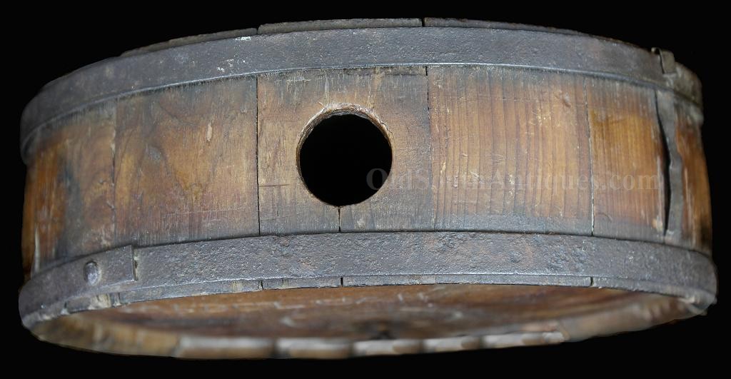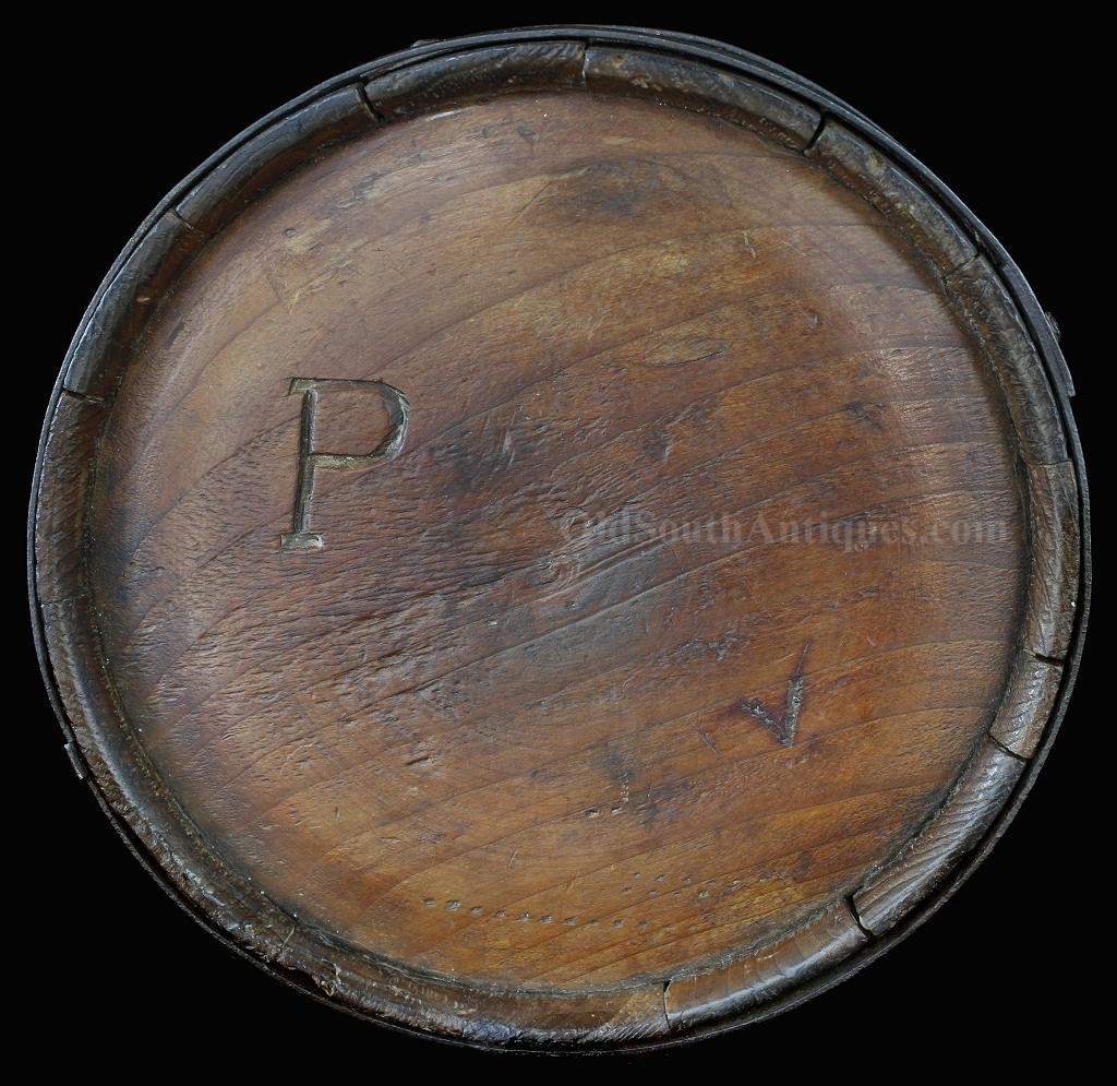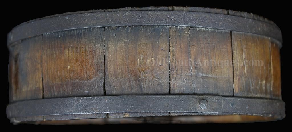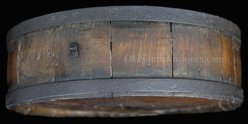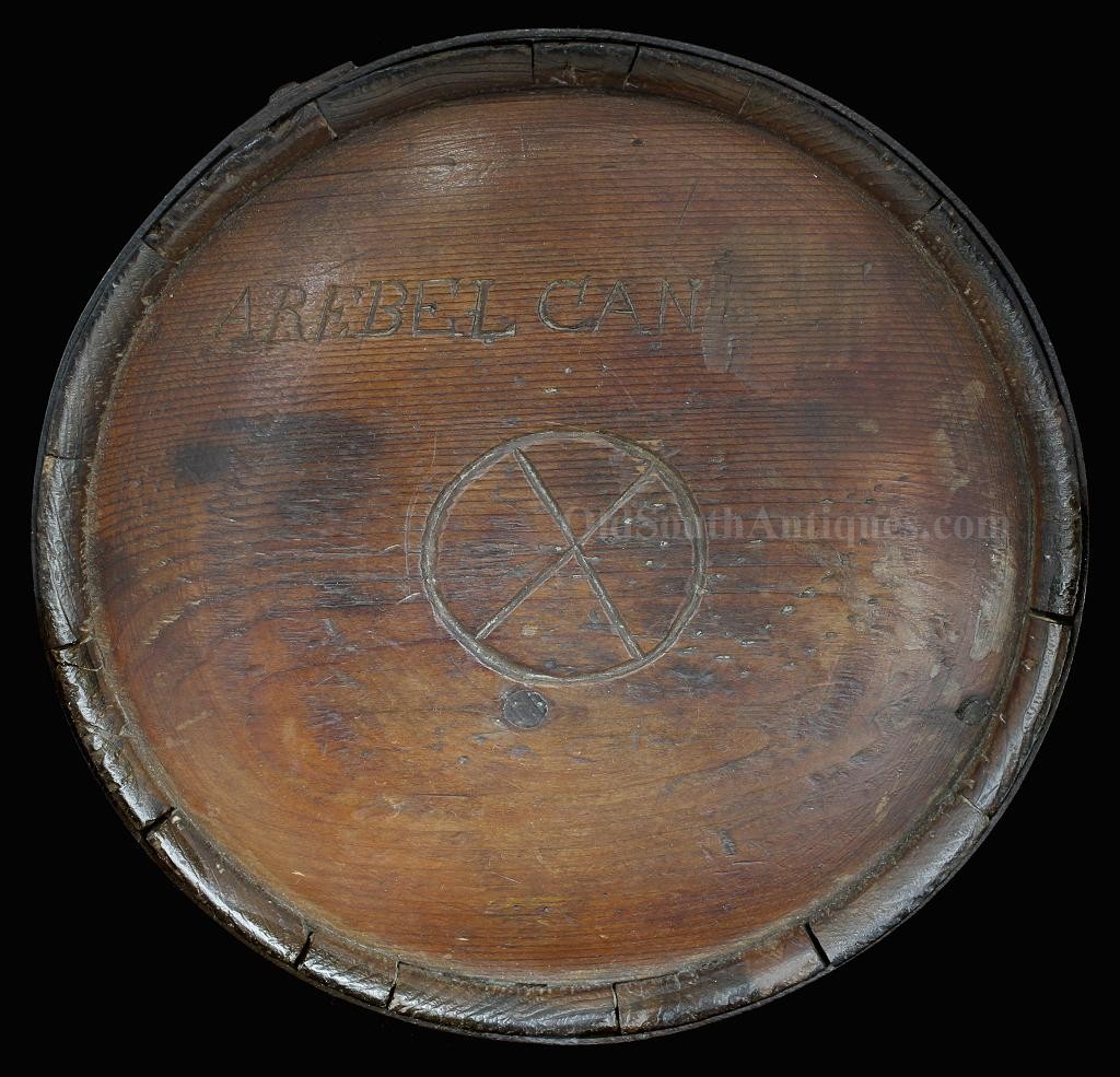 This, the most widely used Confederate canteen was made of wood because any cooperage could easily convert to the manufacture of wooden canteens as they required exactly the same skills as barrel making. Revolutionary War canteens were also made of wood and are often confused with Confederate era canteens. The Confederate canteen can be differentiated from its Revolutionary War counterpart by the lathe turned front and back faces. The front and back faces of the Revolutionary War canteens were cut and shaped by hand, consequently they lack lathe turning marks. The lathe marks are readily apparent on faces of Confederate manufactured canteens like that shown here. The lathe turned wood faces were joined by horizontal slats and banded with iron. The bands were held together with strips of copper or tin that not only formed strap loops, but pulled the outer bands towards the center, tightening them. This particular canteen is the standardized 7 by 2 ¼ inches, held by two iron bands. Two of the tin cross straps are missing. The large carving on the face originally read "A Rebel Canteen” but during its period of use the humor took its owner to carve out the "teen” leaving only "A Rebel Can” The patina on the entire canteen is original and even, leaving no doubt that it was all done at nearly the same period. The is an X in a circle below the text, which could have been merely a decoration or possibly a good luck or Christian symbol. A large "P” and a small "v” are deeply carved into the opposite face. There are also two period cut nails driven into the bottom. The were driven at opposite angles so they would cross each other to make a loop that was suitable to tie to. The canteen remains perfectly tight, (though the outer loops can be pulled off) and totally original to the period.