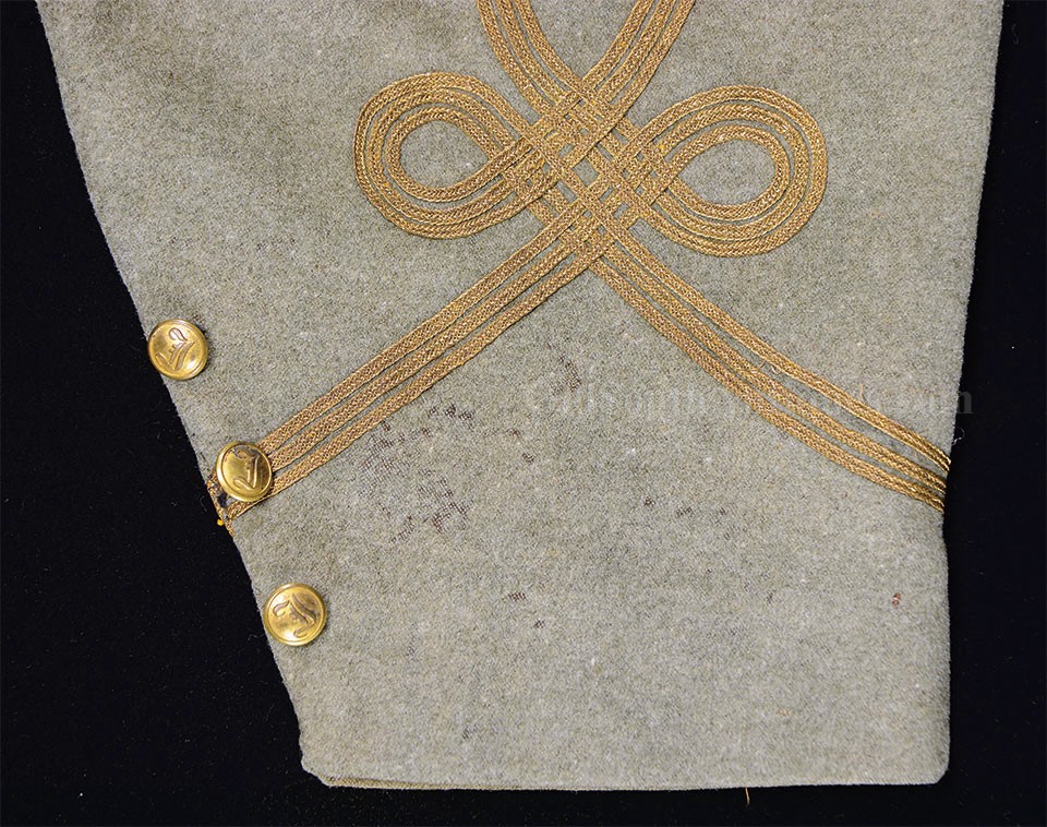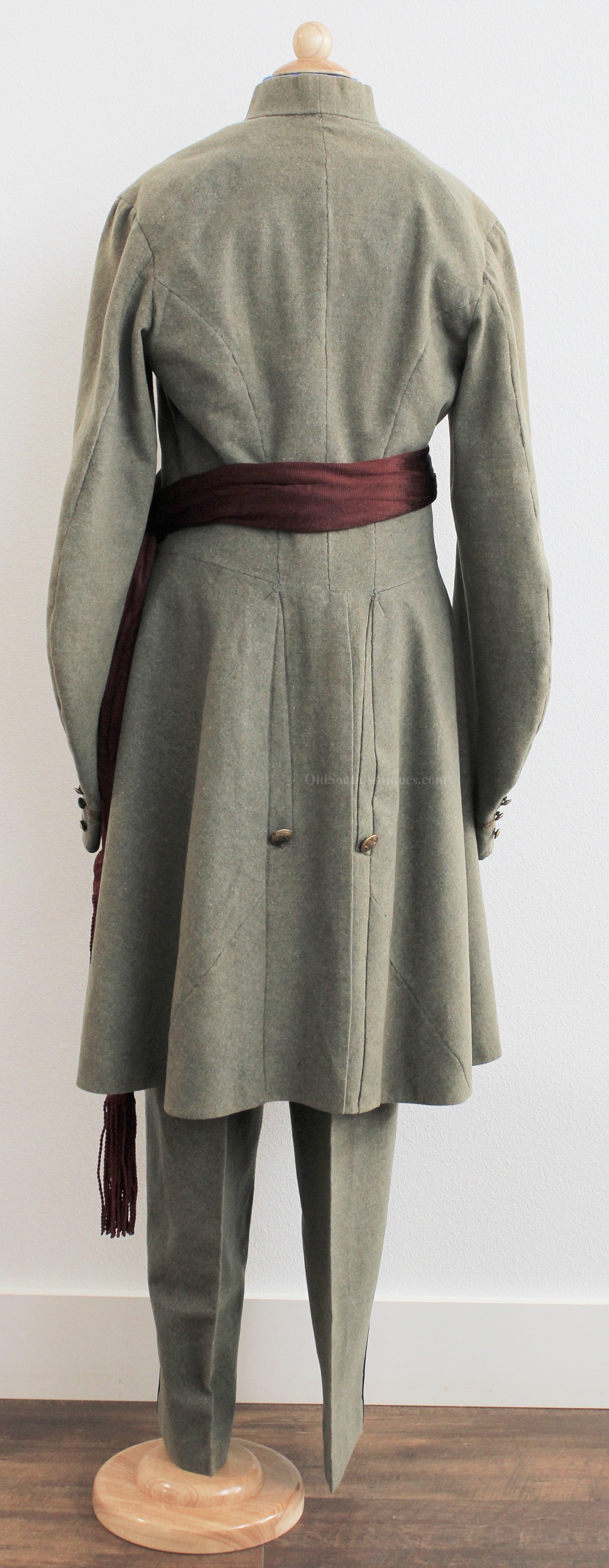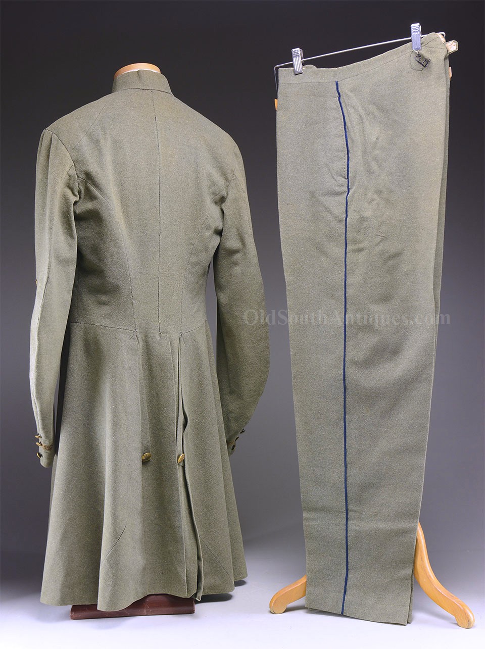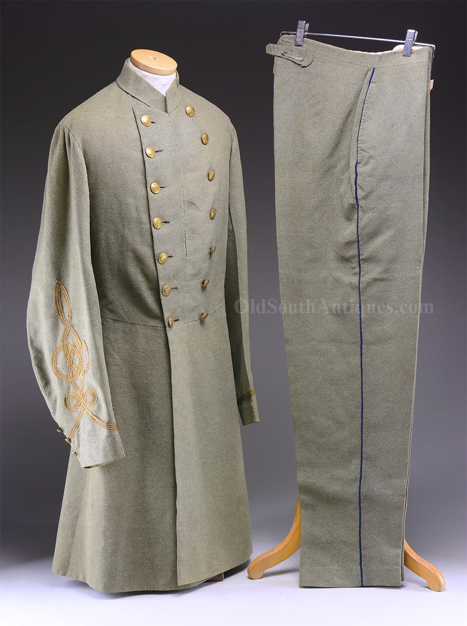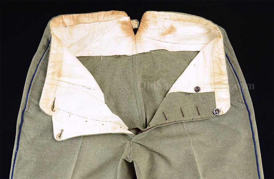 This beautifully tailored uniform consists of both the double-breasted frock coat and the matching trousers of a fine gray woolen broadcloth with infantry blue trim. Curator Les Jensen had already written an examination report on these and recorded their history, so rather than re-inventing the wheel I am pasting his report below. The only thing that I would add, that Mr. Jensen does not mention is that I believe recall that this coat originally had Mississippi I buttons on the breast. The Mississippi I buttons, the sleeve braid, combined with the blue piping indicate that this was worn by a Major, Lt. Colonel or Colonel of Mississippi Infantry. Its condition is stellar; it is nothing short of miraculous that it has remained in this condition for 165 years. The details are recorded below. The sash shown in the pictures is post war; it and the mannequin that it is mounted on comes with the group at no charge. Price $55,000.00 USD