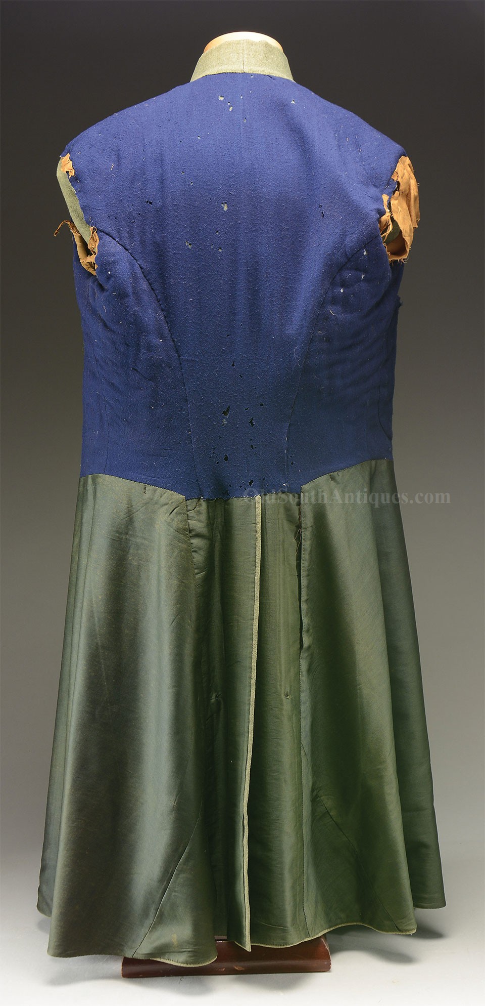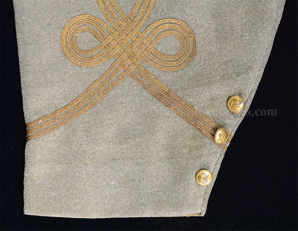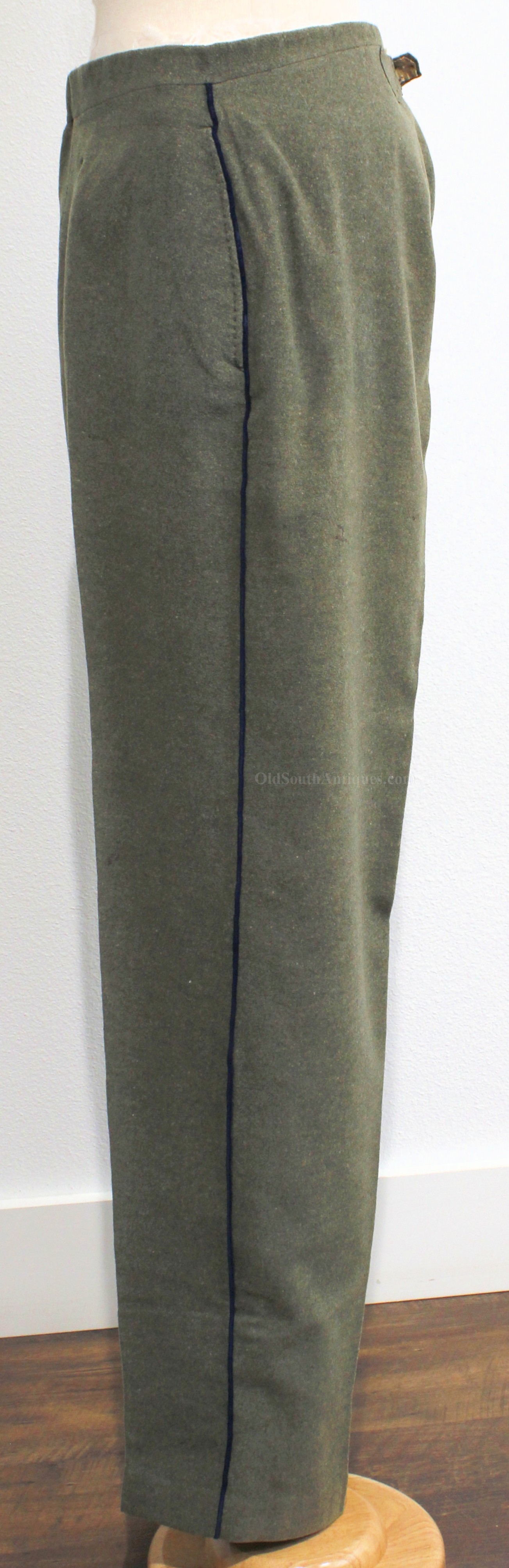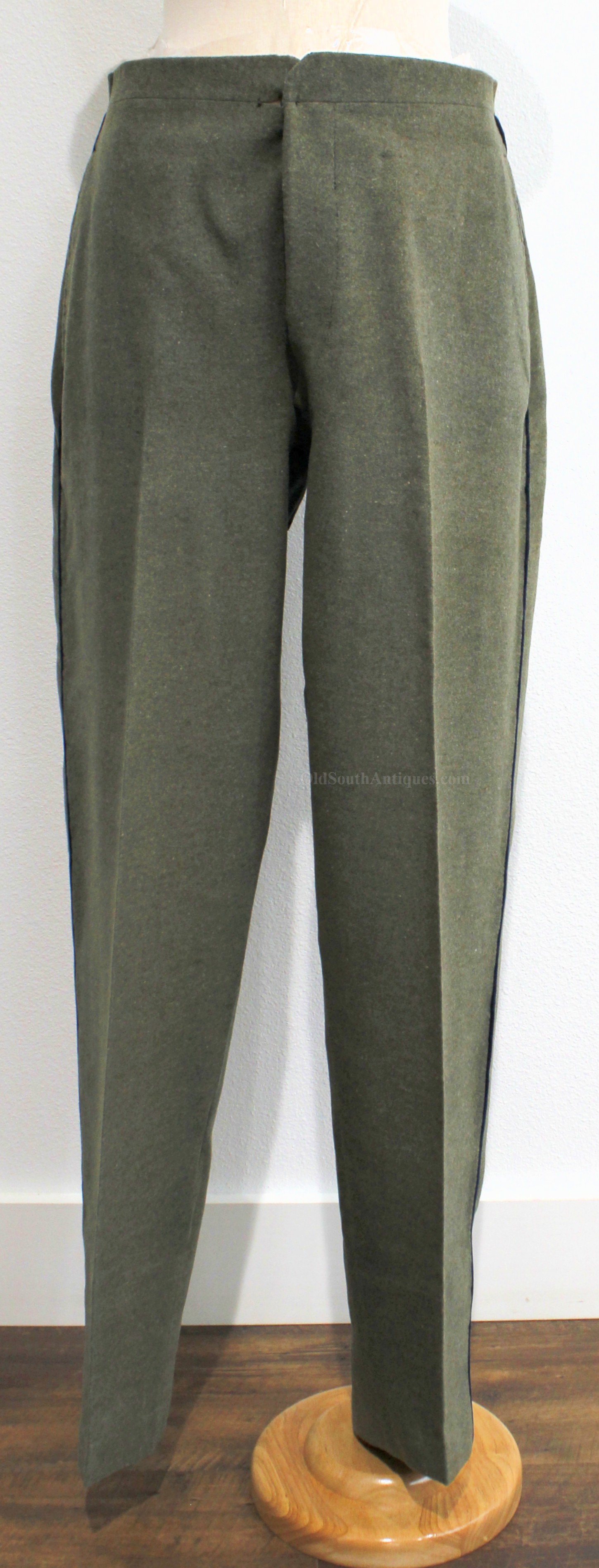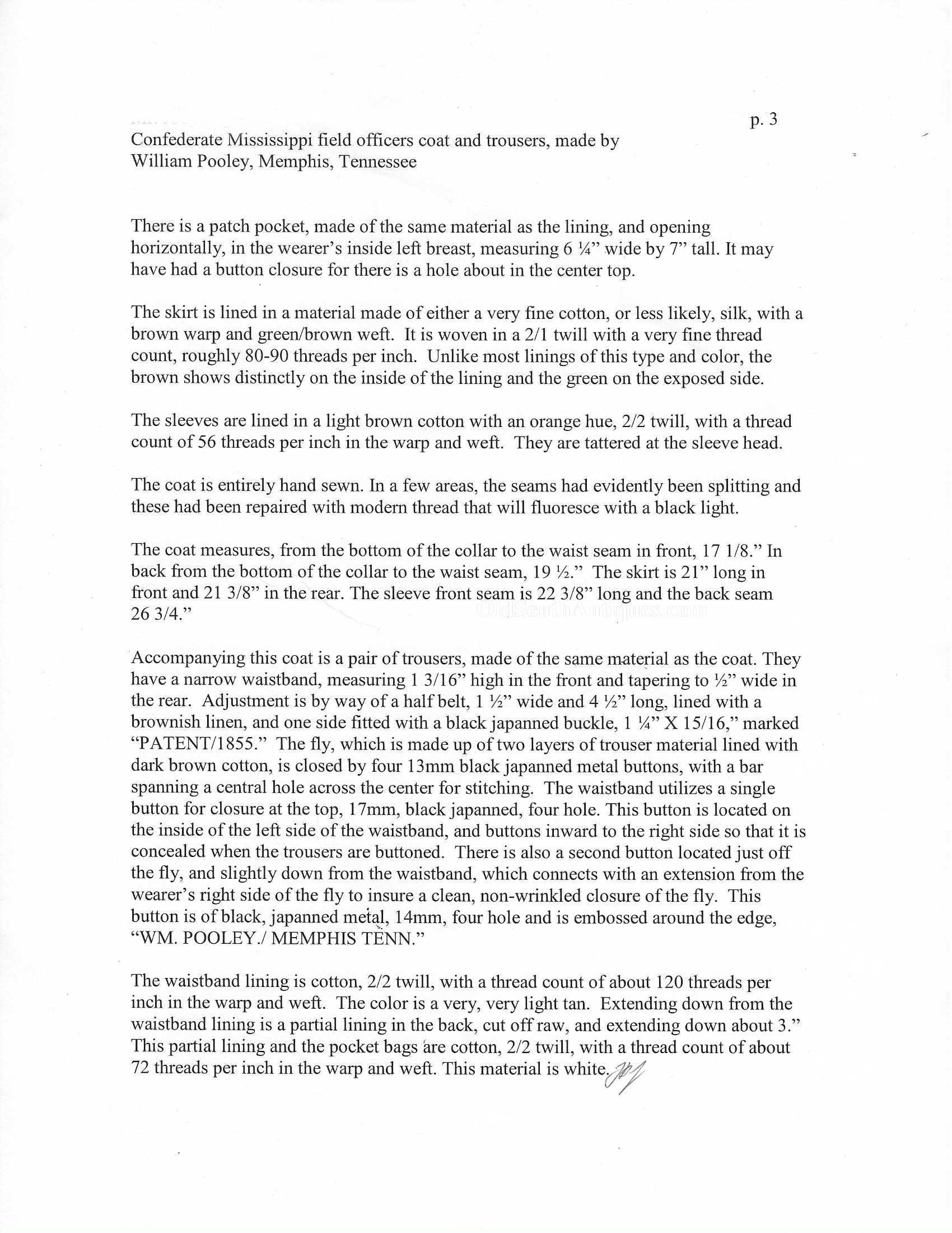 This beautifully tailored uniform consists of both the double-breasted frock coat and the matching trousers of a fine gray woolen broadcloth with infantry blue trim. Curator Les Jensen had already written an examination report on these and recorded their history, so rather than re-inventing the wheel I am pasting his report below. The only thing that I would add, that Mr. Jensen does not mention is that I believe recall that this coat originally had Mississippi I buttons on the breast. The Mississippi I buttons, the sleeve braid, combined with the blue piping indicate that this was worn by a Major, Lt. Colonel or Colonel of Mississippi Infantry. Its condition is stellar; it is nothing short of miraculous that it has remained in this condition for 165 years. The details are recorded below. The sash shown in the pictures is post war; it and the mannequin that it is mounted on comes with the group at no charge. Price $55,000.00 USD