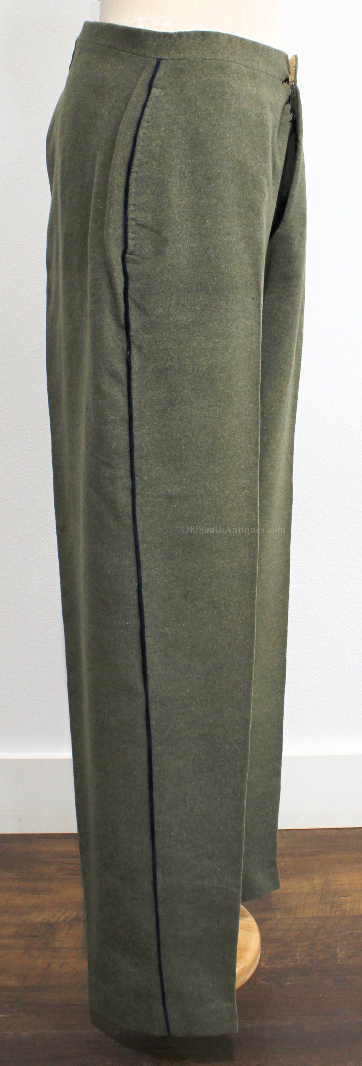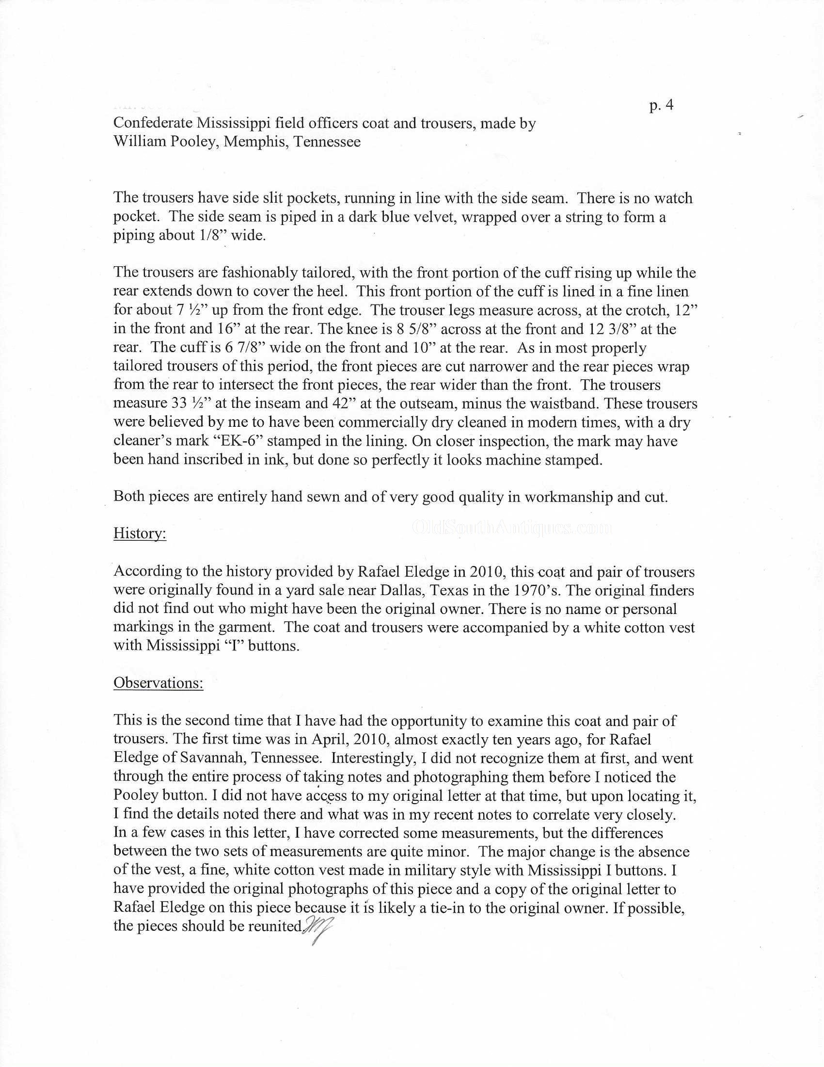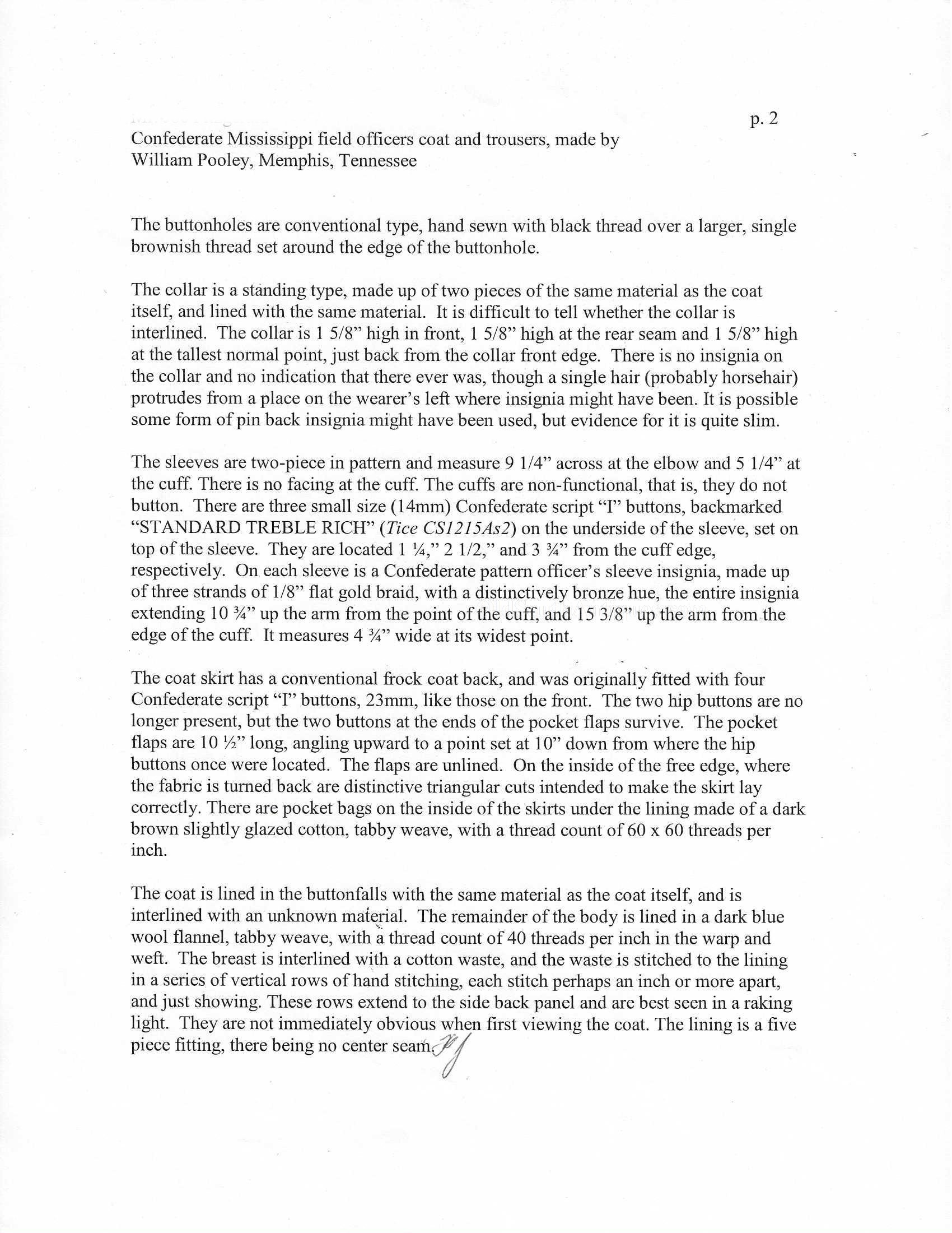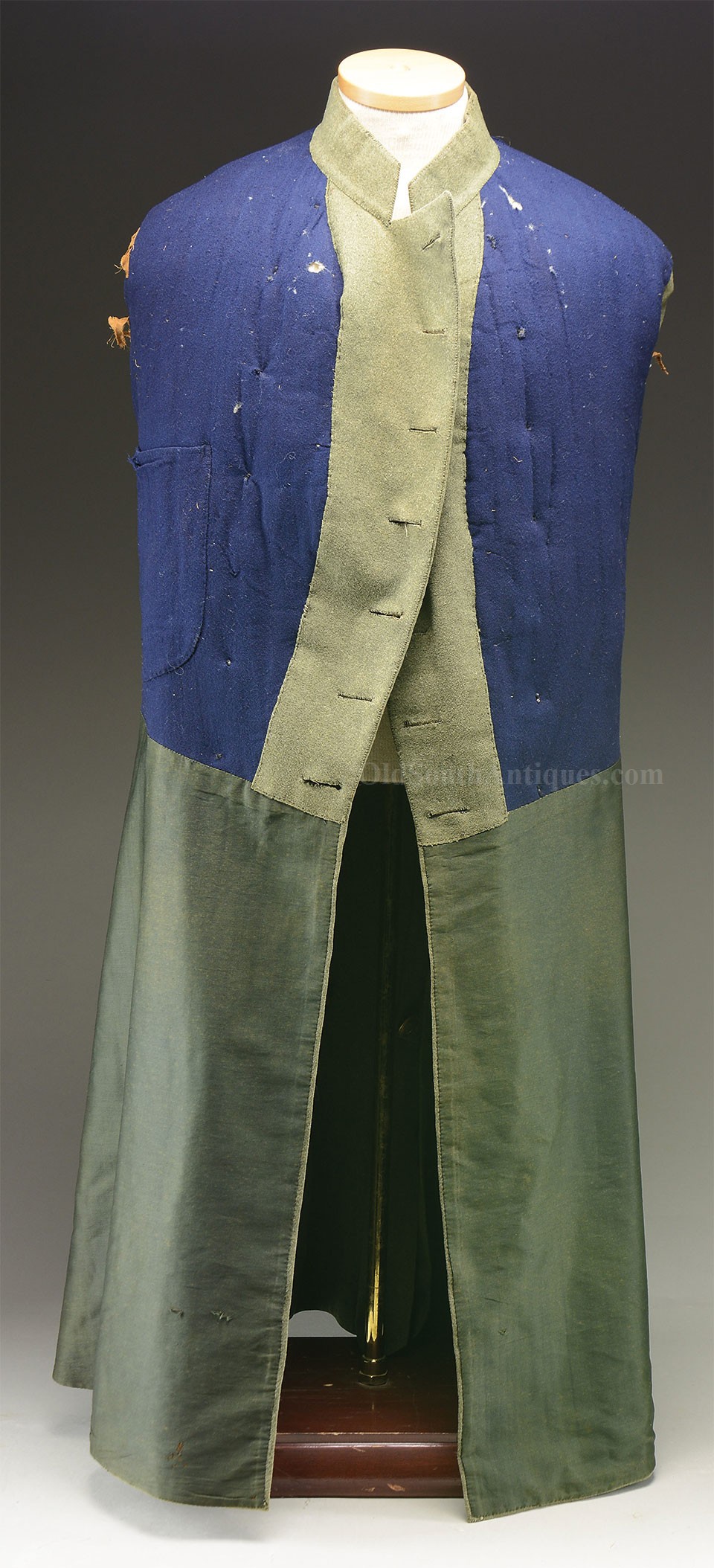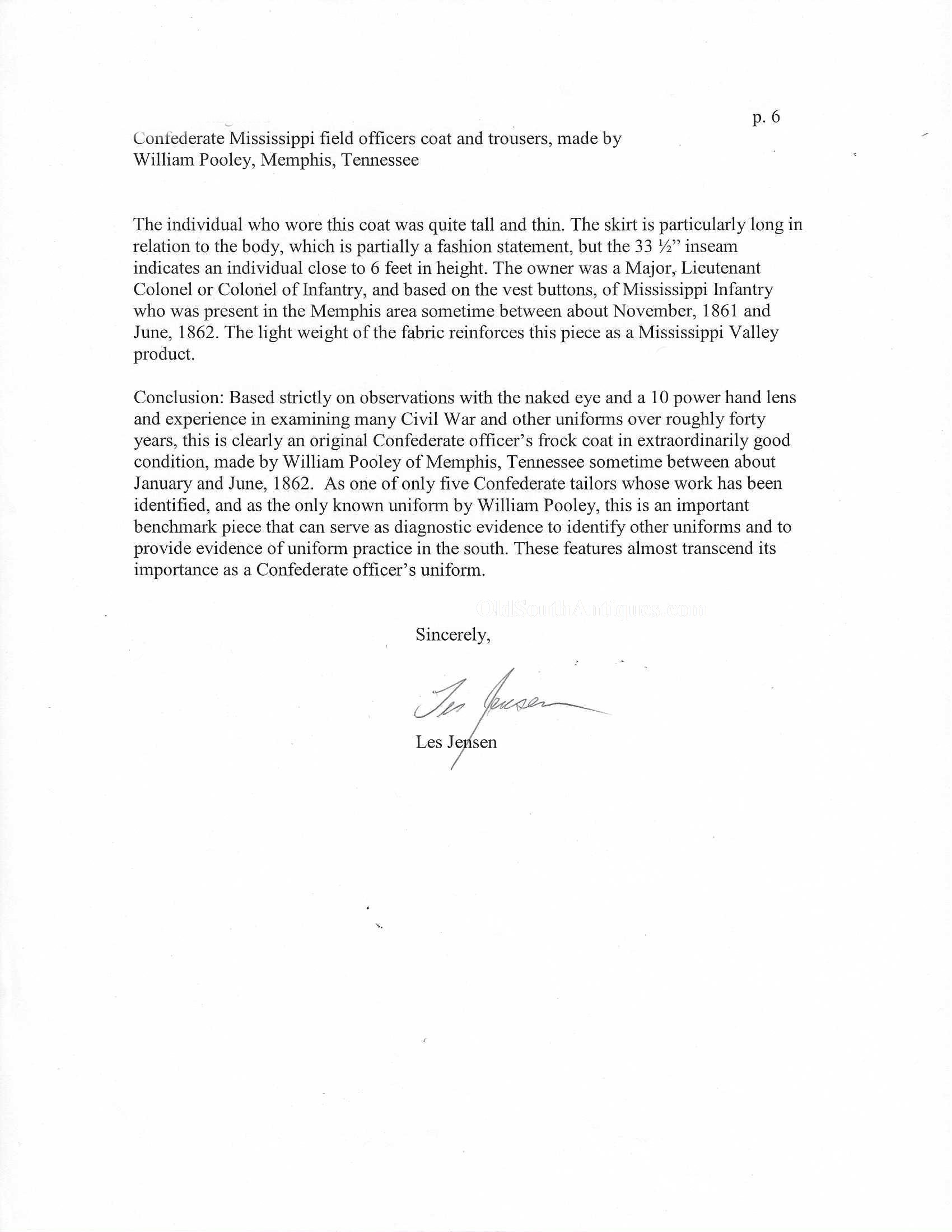 This beautifully tailored uniform consists of both the double-breasted frock coat and the matching trousers of a fine gray woolen broadcloth with infantry blue trim. Curator Les Jensen had already written an examination report on these and recorded their history, so rather than re-inventing the wheel I am pasting his report below. The only thing that I would add, that Mr. Jensen does not mention is that I believe recall that this coat originally had Mississippi I buttons on the breast. The Mississippi I buttons, the sleeve braid, combined with the blue piping indicate that this was worn by a Major, Lt. Colonel or Colonel of Mississippi Infantry. Its condition is stellar; it is nothing short of miraculous that it has remained in this condition for 165 years. The details are recorded below. The sash shown in the pictures is post war; it and the mannequin that it is mounted on comes with the group at no charge. Price $55,000.00 USD