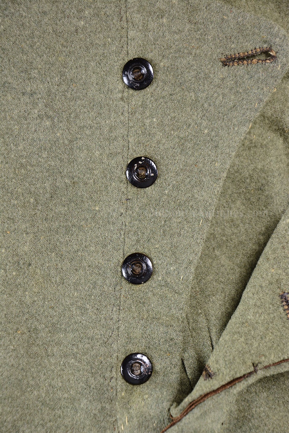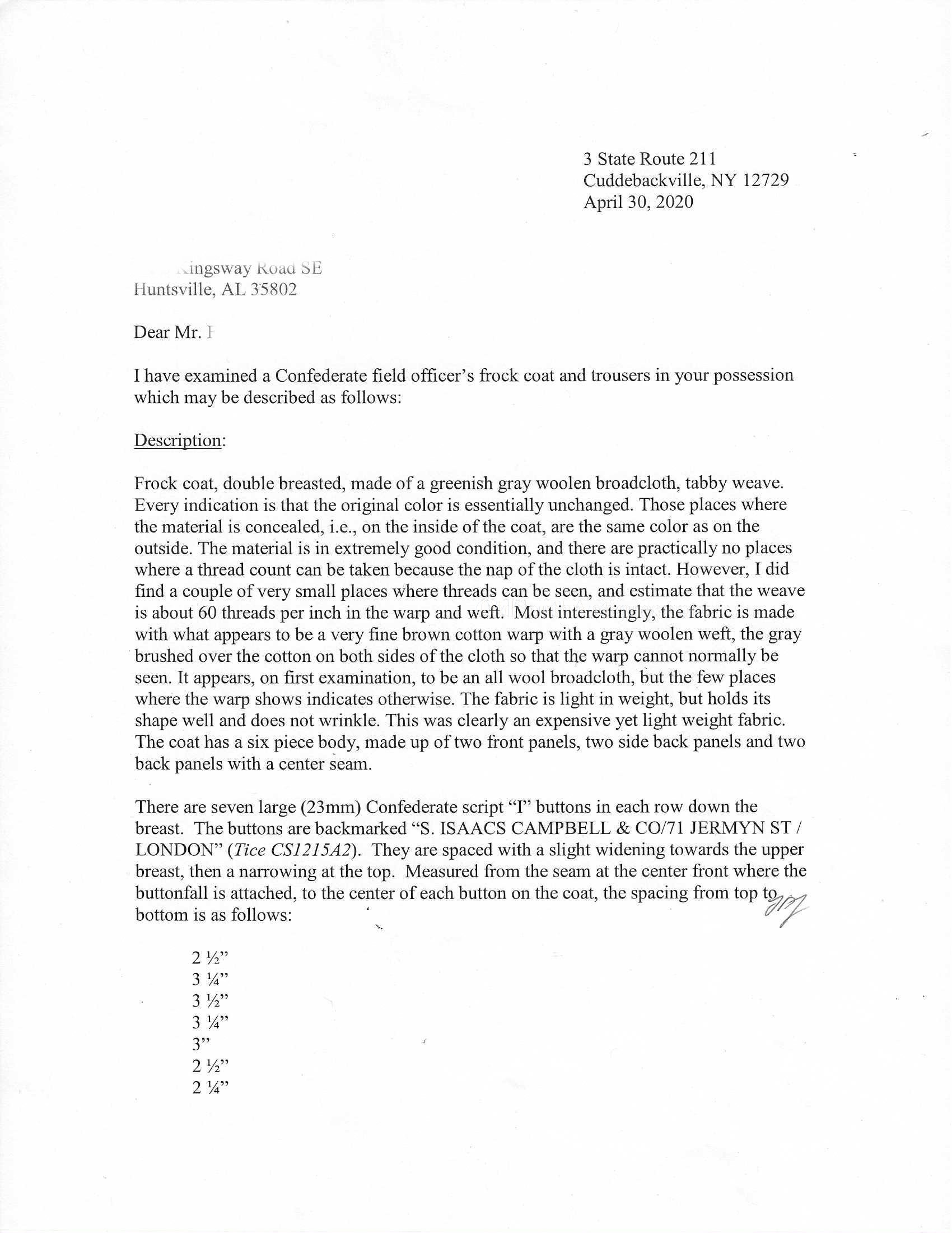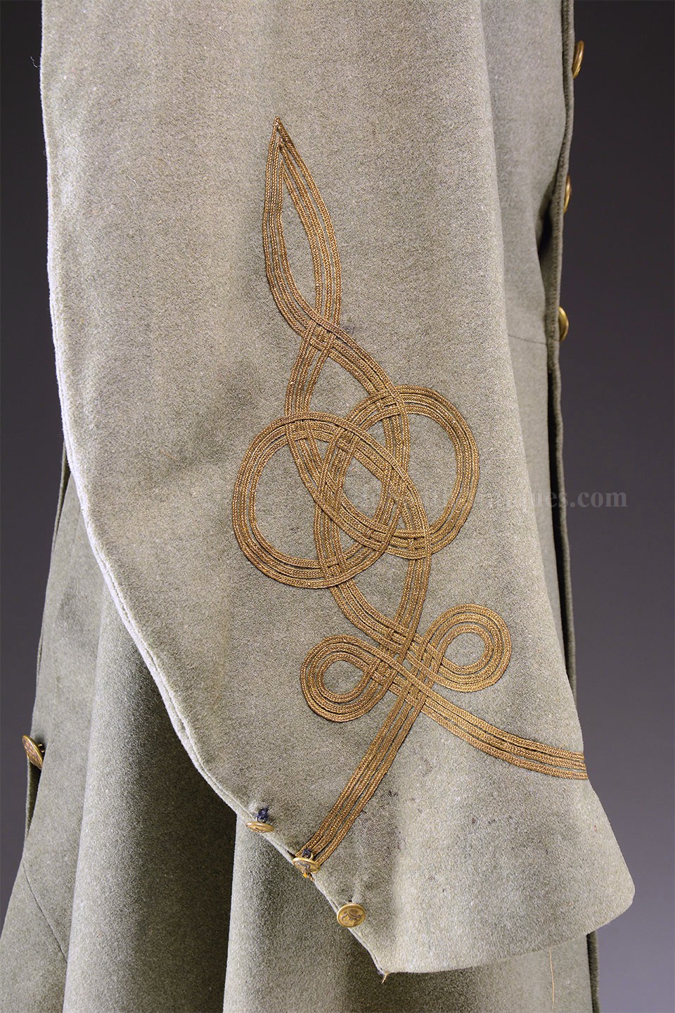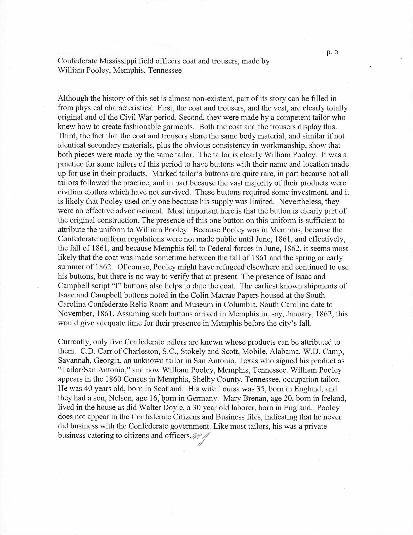 This beautifully tailored uniform consists of both the double-breasted frock coat and the matching trousers of a fine gray woolen broadcloth with infantry blue trim. Curator Les Jensen had already written an examination report on these and recorded their history, so rather than re-inventing the wheel I am pasting his report below. The only thing that I would add, that Mr. Jensen does not mention is that I believe recall that this coat originally had Mississippi I buttons on the breast. The Mississippi I buttons, the sleeve braid, combined with the blue piping indicate that this was worn by a Major, Lt. Colonel or Colonel of Mississippi Infantry. Its condition is stellar; it is nothing short of miraculous that it has remained in this condition for 165 years. The details are recorded below. The sash shown in the pictures is post war; it and the mannequin that it is mounted on comes with the group at no charge. Price $55,000.00 USD