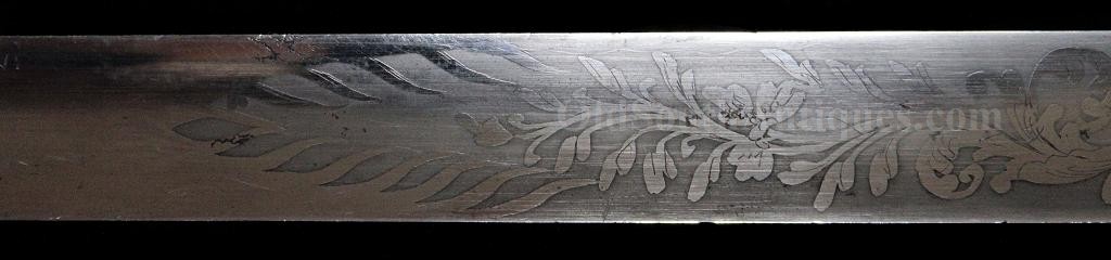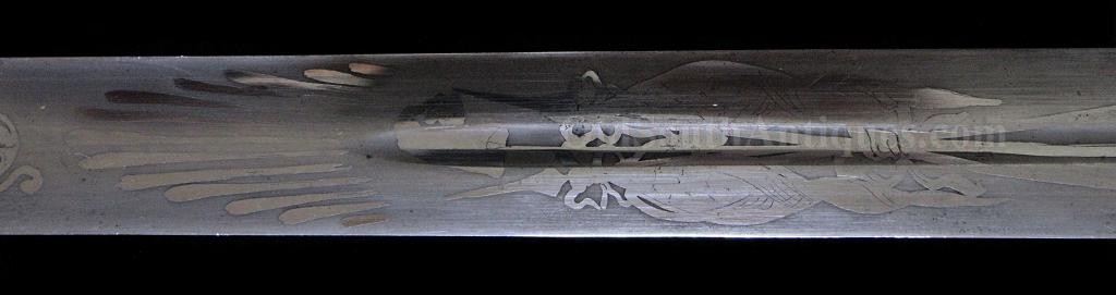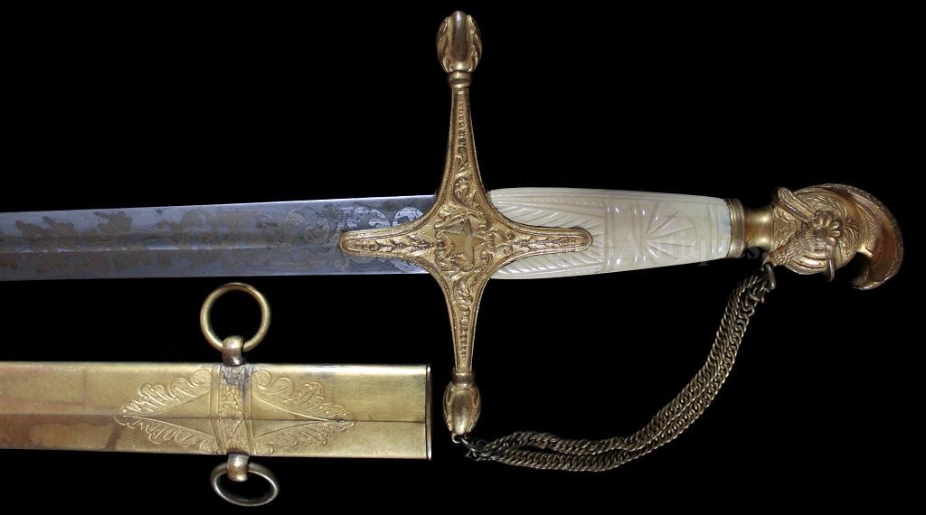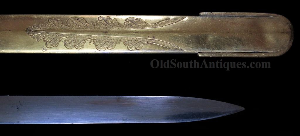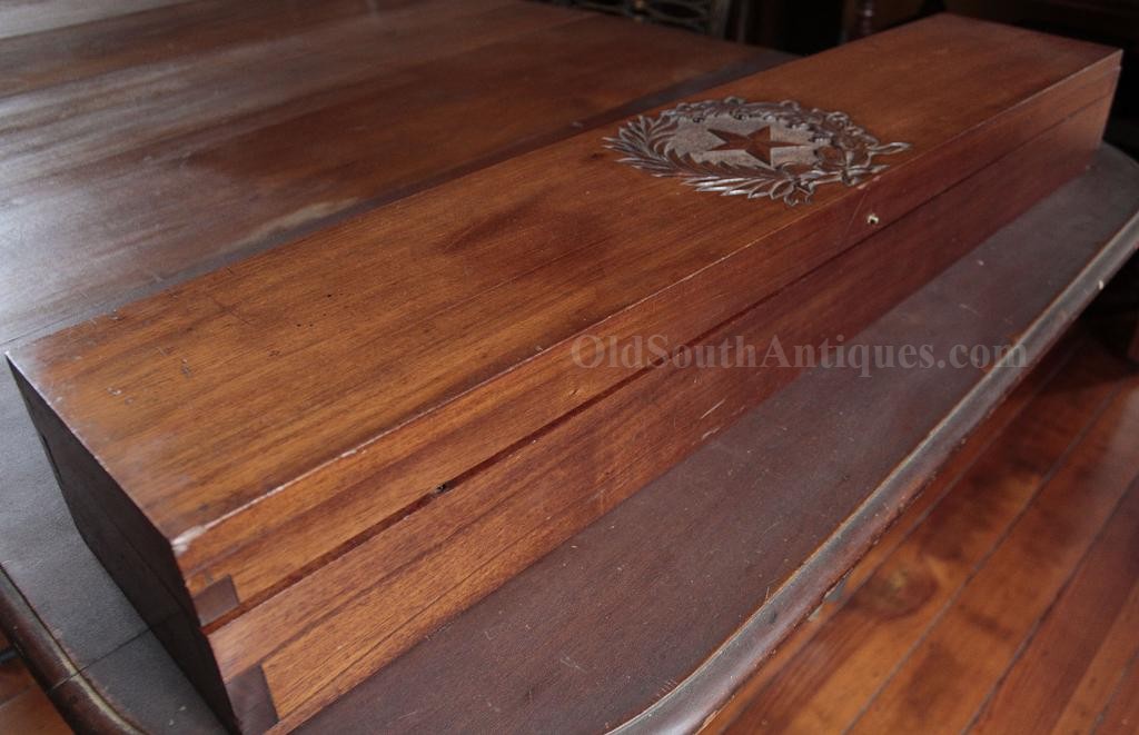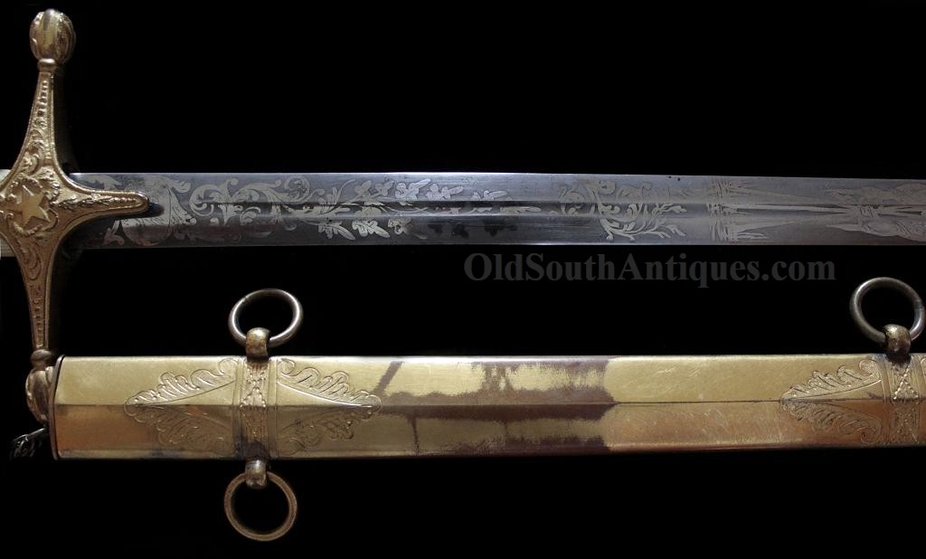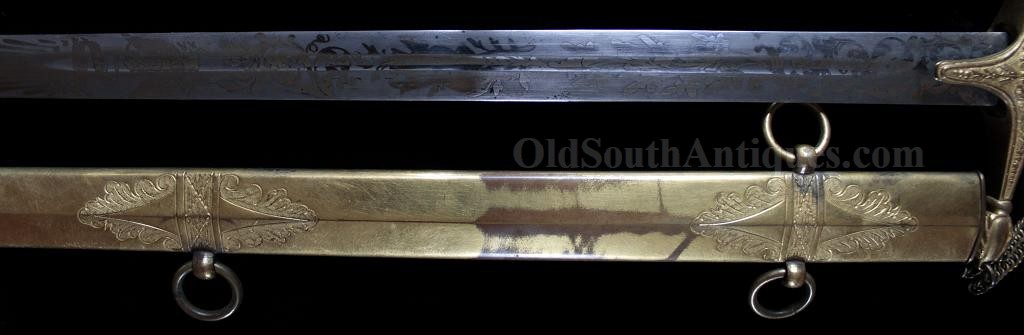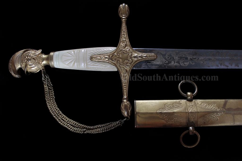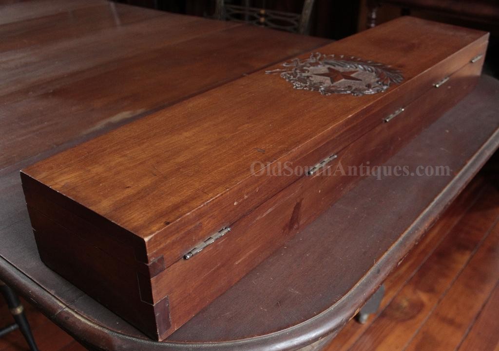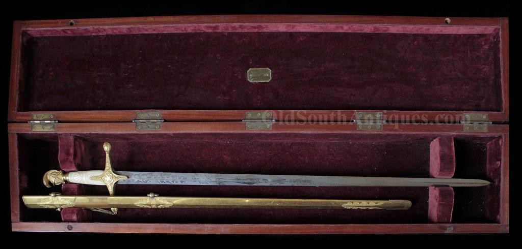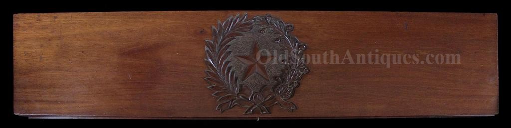 The beautiful sword shown here was made and marked by Ames Manufacturing. It is the stock "star” pattern Model 1850 staff sword that Ames produced and sold to multiple states, but into the presentation case is ornately carved the Seal of the Great State of Texas! This of course means that rather than just a stock "star” on the sword’s hilt, it is a Texas star. A gilted signature panel with the initials "L.P.K.” engraved is tacked to the underside of the lid. The sword was carried by some wealthy and/or prominent Texan with these initials. Perhaps some of my Texas readers will recognize who these belong to? If so, please let me know. The sword was made between 1850 and 1861 and I believe it was presented and/or worn in the later years and into the War because there is an extreme amount of wear where the scabbard slid through the leather frog (as shown in the images). I do not believe that a political officer or militia officer would have carried it enough for leather to have created this much wear, though admittedly this is an opinion. The blade is elaborately etched with crossed flags surmounted by a liberty cap on a liberty pole; a droop winged eagle grasping arrows and holding a ribbon in its beak that is engraved E. Pluribus Unum; it is also etched with a panoply of arms and a panel engraved Ames Mnfg, Chicopee Mass. The blade’s luster and etching remains extremely bright and is perfect with the exception of two tiny, tiny edge nicks. The bone grip is ornately carved, the pommel is decorated with a plumed knight’s head and it has a gilted double chain hand guard. The blade and grip remain as tight as the day it was made. The sword is sheathed in its original ornately engraved gilt brass scabbard. It is virtually perfect; the only imperfections are several light pushes in the brass near the drag and the before mentioned wear. The scabbard is beautifully engraved with foliate patterns and panels that look like Army of Tennessee flags, though they could not be unless this was made during the War, and I do not believe that it was. The most remarkable piece is the ornately carved presentation case. I have never seen another presentation case that would compare and I know of no other with a state seal relief carved on the lid. The case and its plush red velour like lining are in near perfect condition with the exception of one missing pull knob. This is one of the most beautiful pieces of history I have had the privilege to own.Price $15,500.00 USD